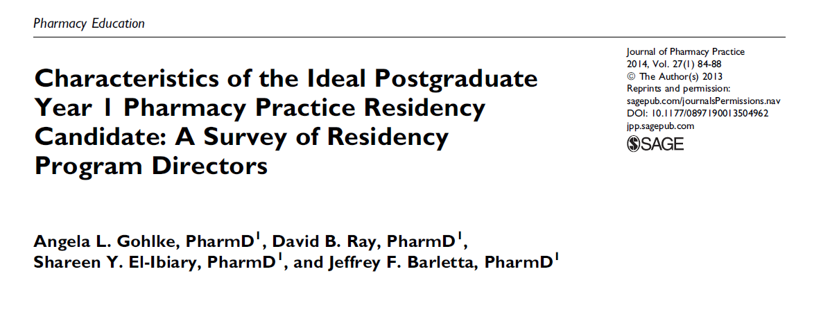 - Gohlke AL, Ray DB, El-Ibiary SY, Barletta JF. Characteristics of the ideal postgraduate year 1 pharmacy practice residency candidate: a survey of residency program directors. J Pharm Pract. 2014;27(1):84–88. doi:10.1177/0897190013504962