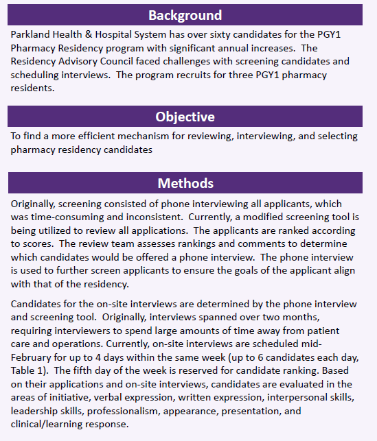 - Can you summarize your publication “ A Screening Tool to Identify Qualified Pharmacy Residency Candidates”